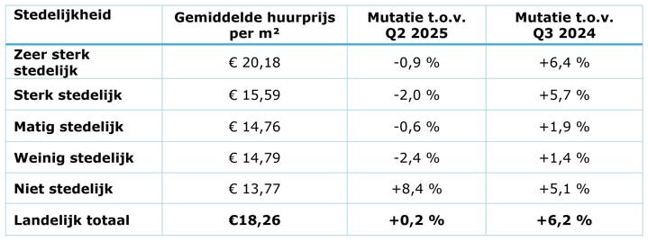 In het 3e kwartaal 2025 tonen de huurprijzen per m² in de vrije sector een gemengd beeld. Na sterke stijgingen in het tweede kwartaal dalen de prijzen in de meeste stedelijkheidscategorieën. In zeer sterk stedelijke gebieden, waaronder Amsterdam, Rotterdam, Den Haag en Utrecht, daalt de gemiddelde huurprijs dit kwartaal tot €20,18 per m² (-0,9%), terwijl dit op jaarbasis nog steeds 6,4% hoger ligt. Ook in minder sterk stedelijke gebieden zijn er op kwartaalbasis lichte dalingen. Alleen in niet-stedelijke gebieden stijgen de prijzen, met een opvallende toename van 8,4% ten opzichte van het vorig kwartaal. Het grootste deel van de vrije sectorverhuur vindt plaats in (zeer) sterk stedelijke gebieden, samen ongeveer 80%. Daardoor blijft het landelijke gemiddelde sterk beïnvloed door prijsvorming in de stedelijke markten.